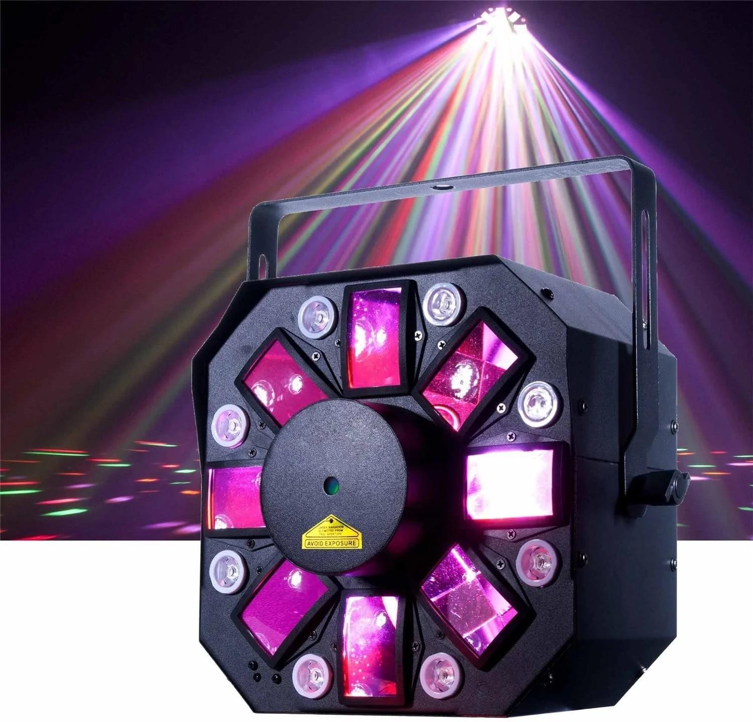 • Efectos 4 en 1 de alto rendimiento: efecto Moonflower, estroboscópico y láser con 6 LED RGBAWP HEX de 5 W + 8 LED UV de 3 W + tecnología de láser rojo y verde que produce haces de luz que cambian de color