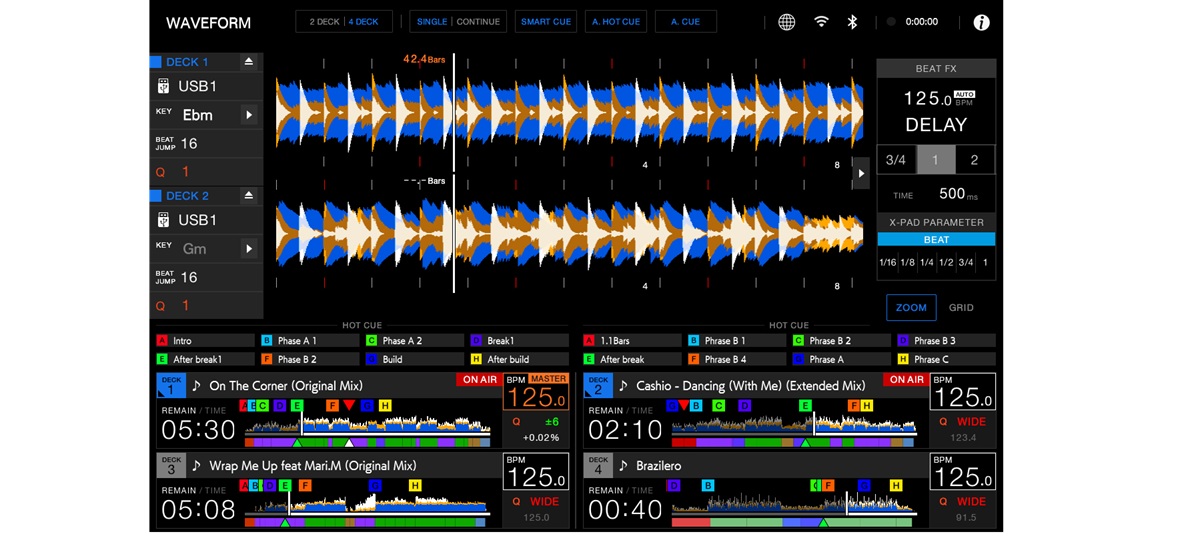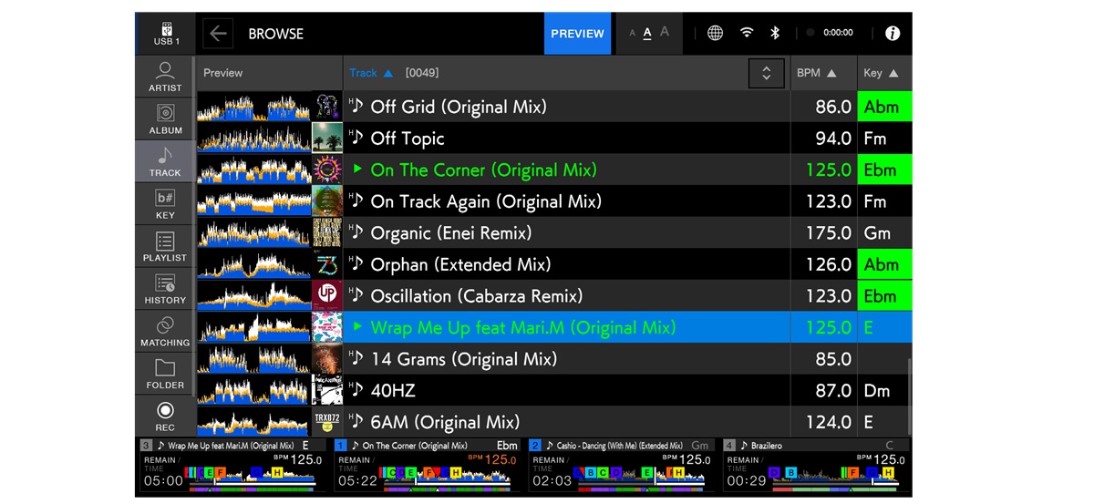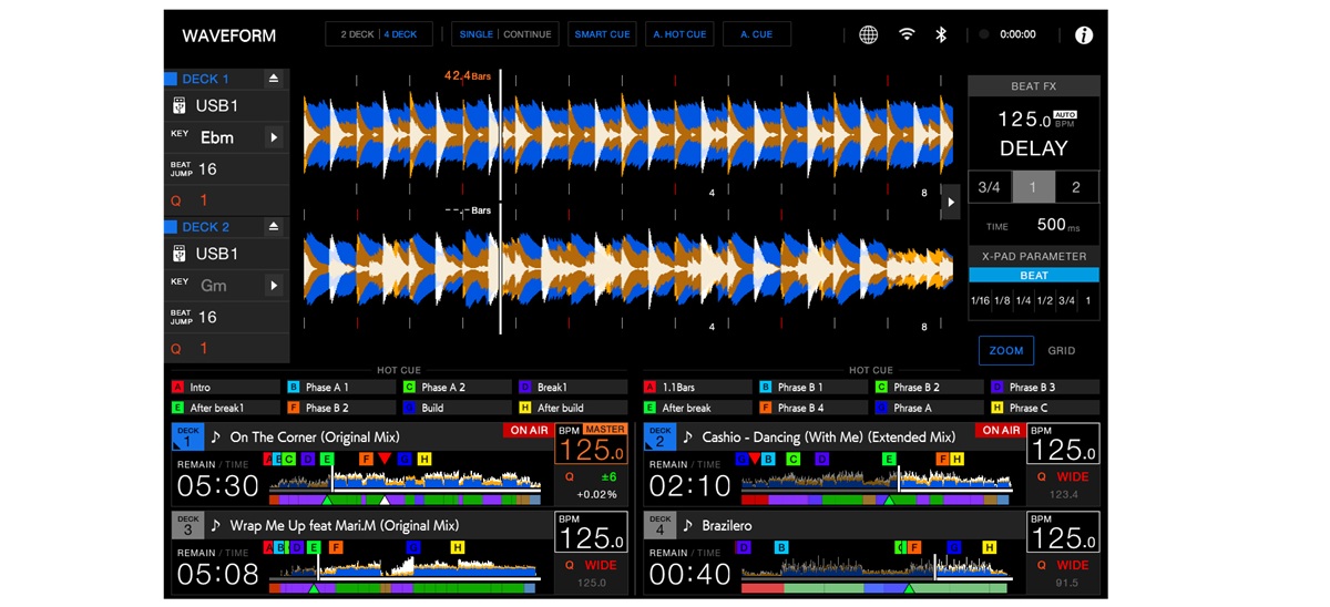 Gracias a la función StreamingDirectPlay, ahora puede acceder directamente a Apple Music desde el XDJ-AZ. Por tanto, puede cargar pistas y listas de reproducción directamente desde el servicio de streaming, con análisis automático de BPM y grid. Las formas de onda visibles en pantalla para cada pista permiten ajustar el ritmo de forma intuitiva y precisa, para unas actuaciones de DJ fluidas y dinámicas.
