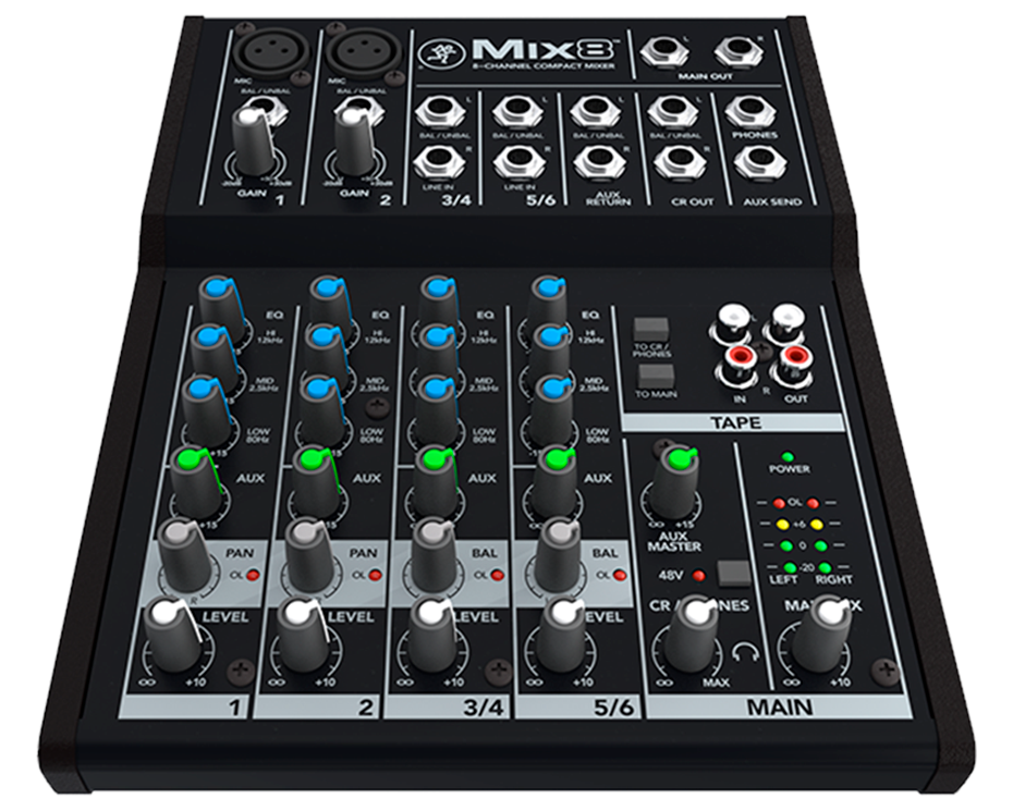 • Mezclador compacto de 8 canales de Entrada con alto headroom probado y bajo nivel de ruido