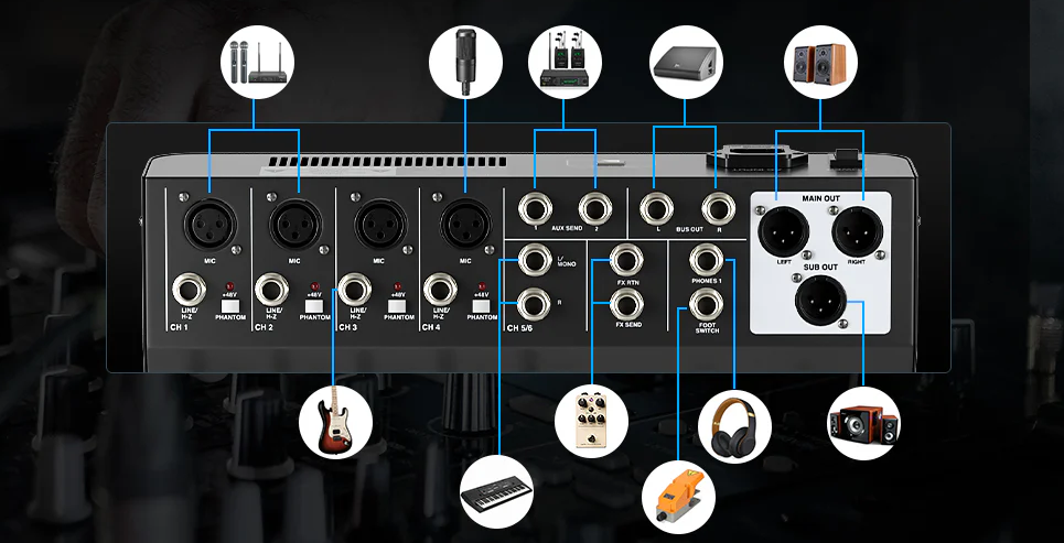 - Amplia conectividad: este mezclador de audio ofrece amplias opciones de entrada y salida. Las entradas flexibles de 4 XLR/LINE independientes, un par de L/R TRS y Bluetooth mejoran la capacidad de la configuración de audio. Las diversas salidas de 2 AUX, 1 BUS, 2 auriculares estéreo y 3 salidas principales XLR (L, R, SUB) satisfacen diferentes necesidades de monitoreo: use la salida Sub para subwoofers activos y la salida BUS para una señal separada en transmisión en vivo. Este controlador de DJ garantiza una conectividad integral para cualquier profesional del audio.