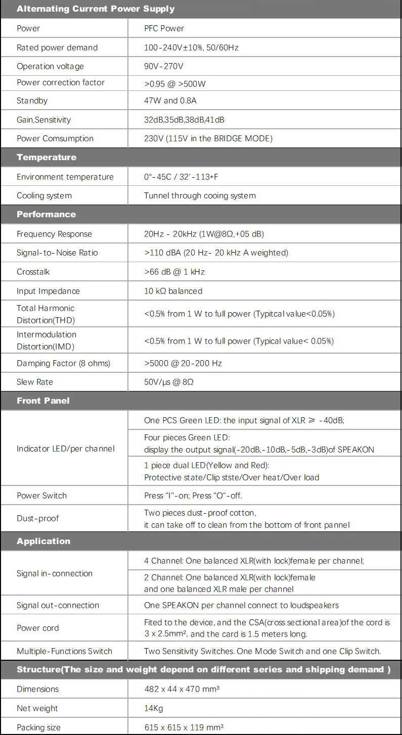 El D4-2000 DSP utiliza un transistor importado, eficiente y con suficiente potencia. Un transformador estable protege el amplificador para un funcionamiento seguro. El amplificador de potencia digital D4-2000 DSP, basado en dispositivos de alta eficiencia, ofrece menor distorsión y menos ruido que los amplificadores tradicionales. El diseño de ventilación del panel y un pequeño ventilador disipan el calor eficientemente, lo que reduce el tamaño del D4-2000 1u, pero ofrece una salida potente y estable de 4 x 2000 W/3400 W/4760 W. Las interfaces XLR y SPEAKON originales de Neutrik crean conexiones eficientes y seguras entre dispositivos. Ideal para arreglos lineales y altavoces de rango completo (2 Ω). El D4-2000 DSP utiliza un sistema ALLDSP ALLControl de Alemania. Este amplificador es compatible con sistemas Windows, Mac e iOS, lo que proporciona versatilidad y un sonido de alta calidad.