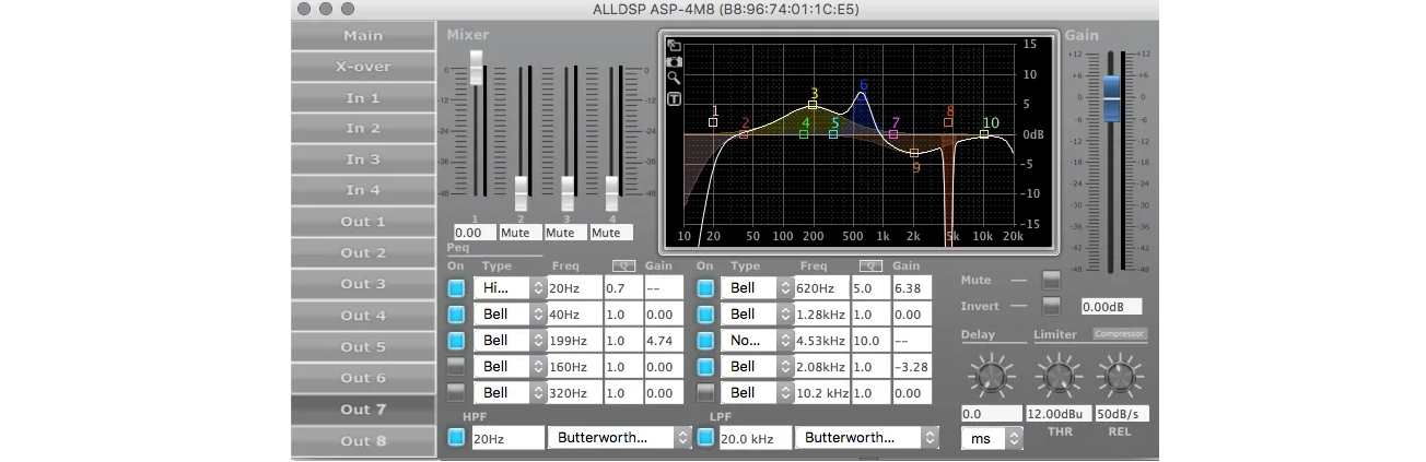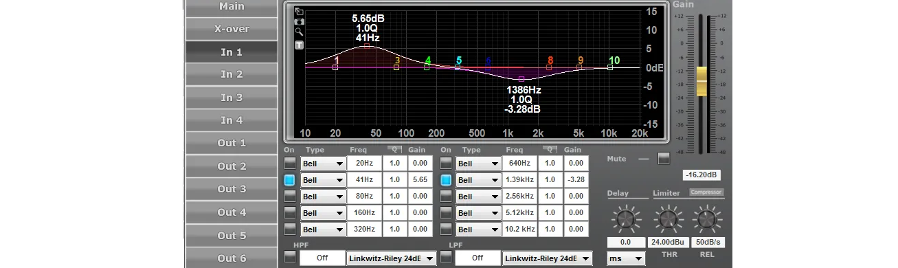 ●Control gráfico ●Tipo de filtro ●Ganancia ●Retardo ●Enlace ●Silencio, inversión de fase |